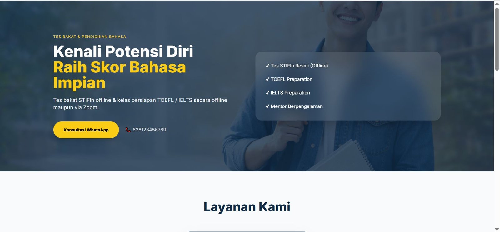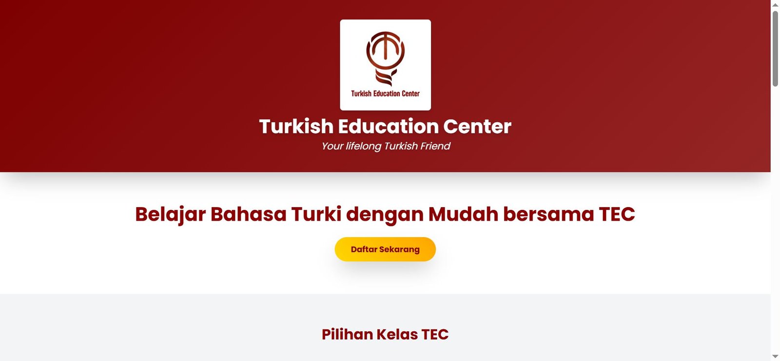 Website kursus bahasa Turki dengan CTA WhatsApp & desain modern.
